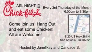 Hello Spring 🐔! It’s time for Chick-fil-A night! Come hang out, eat some chicken and have some laughs!