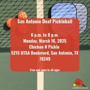 Let’s play some pickleball! Join the San Antonio Deaf Pickleball group Monday March 16th from 6pm to 8pm at Chicken N Pickle-San Antonio. We’re open to all ages and free to all so come on by no matter your skill level and let’s have some fun! 🥳